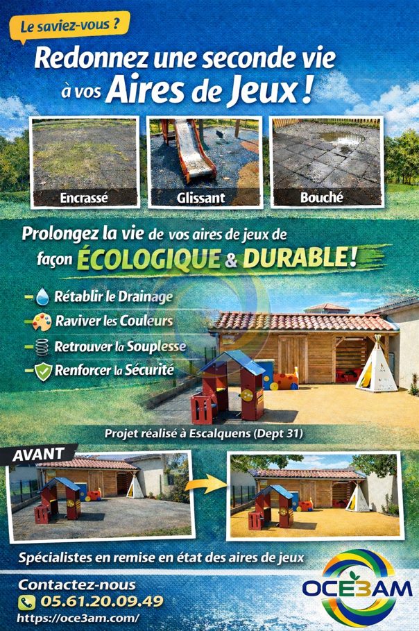 Lorsque les techniques de nettoyage conventionnelles ne permettent plus d’assurer un niveau satisfaisant d’entretien, OCE3AM met en œuvre des prestations de remise en état visant à prolonger la durée de services des aires de jeux de façon écologique et éco-responsable. 🌍