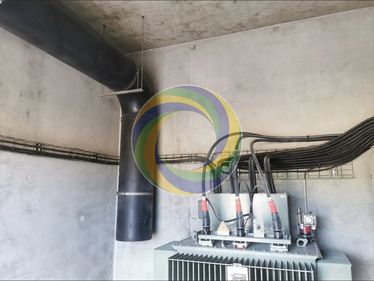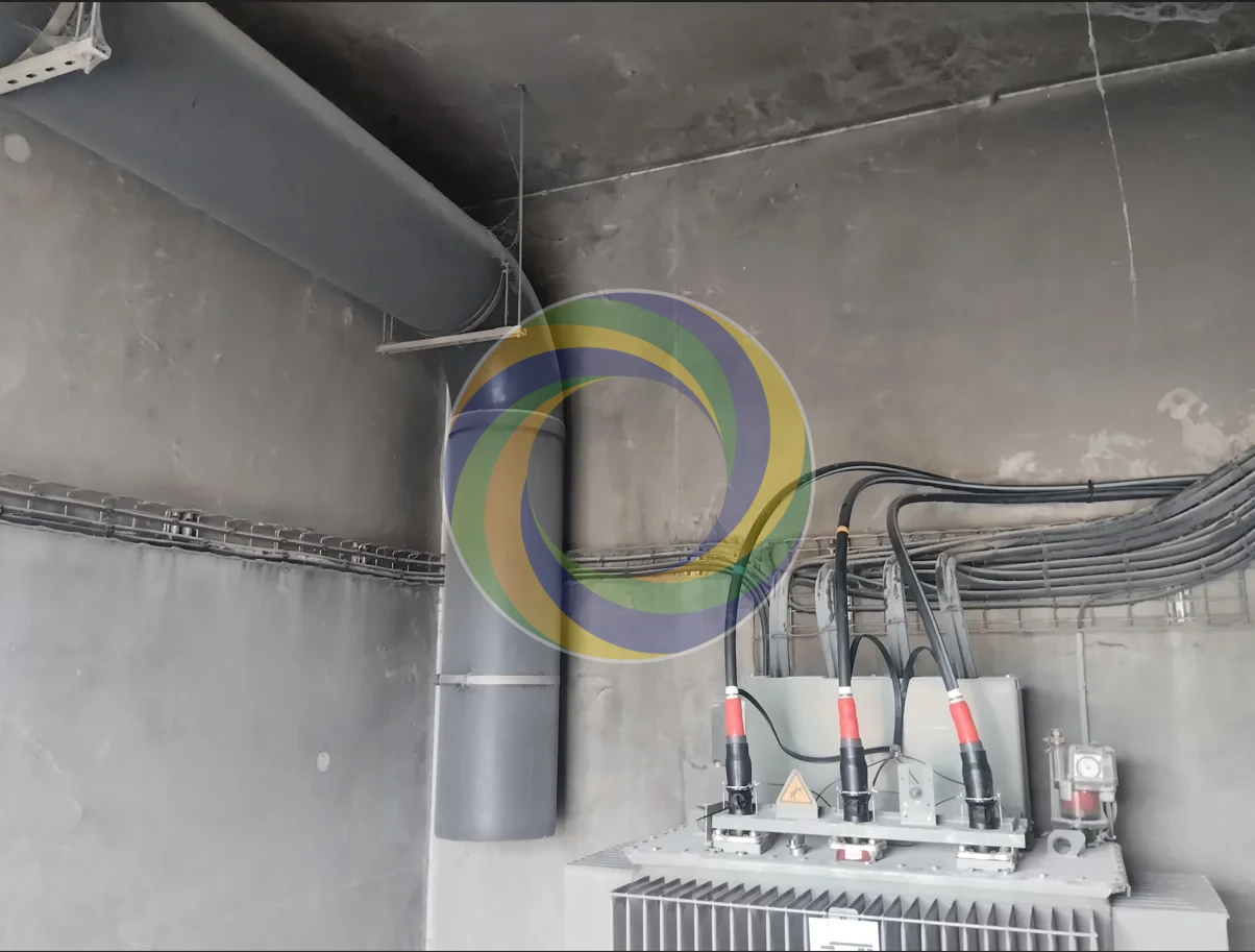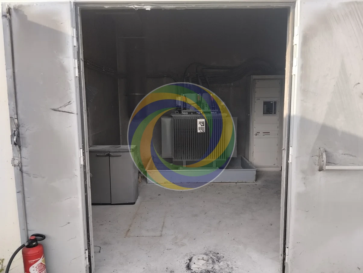 Sur la vue d’angle gauche de la cabine, le nettoyage a ciblé les parois, les chemins de câbles et les éléments de structure affectés par la suie.