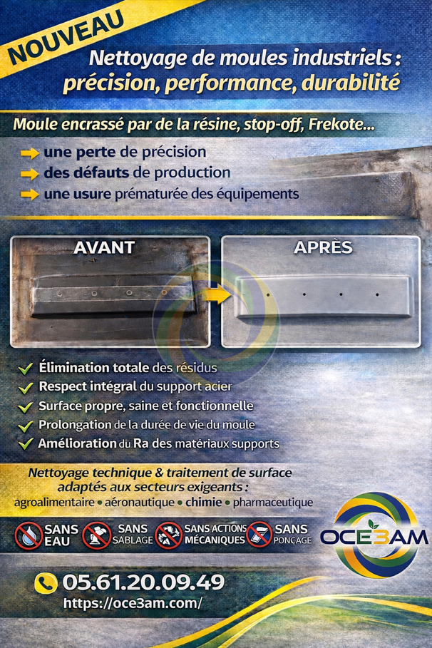 Chez OCE3AM, nous privilégions des méthodes écologiques et non abrasives, parfaitement adaptées aux contraintes industrielles, pour garantir performance, sécurité et durabilité, sans compromis sur l’intégrité des pièces.