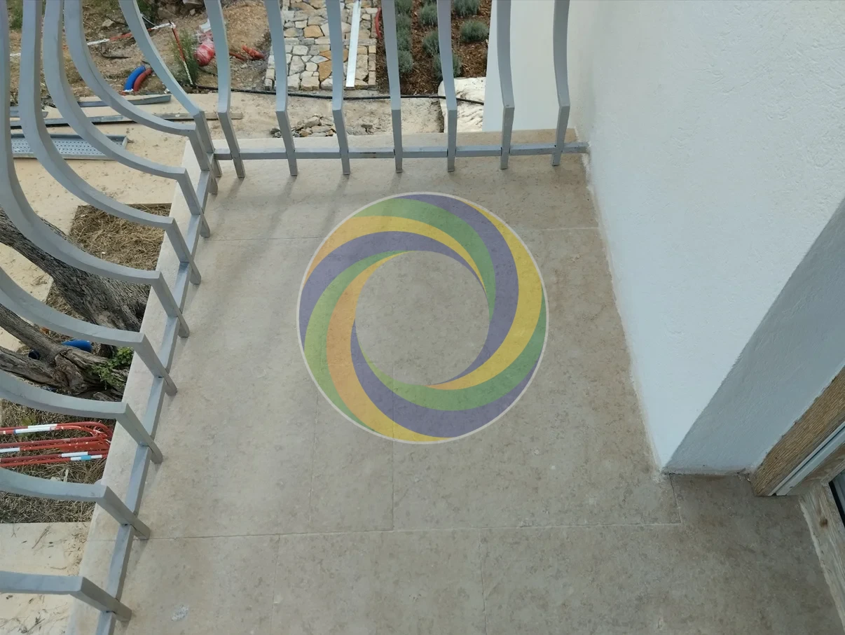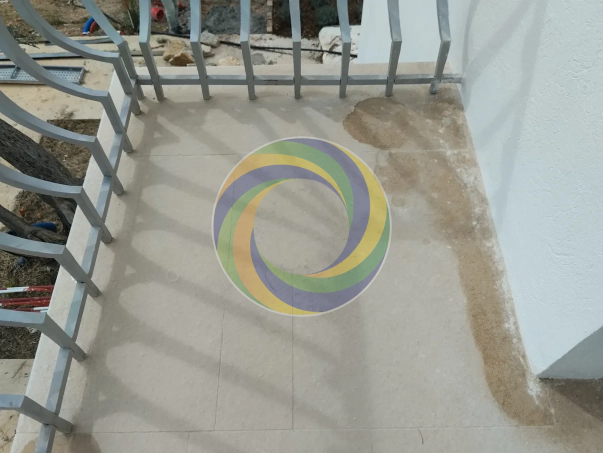 Sur cette terrasse d’un bâtiment public, des taches de graisse et des résidus de peinture altéraient la surface et l’esthétique de l’espace extérieur.
