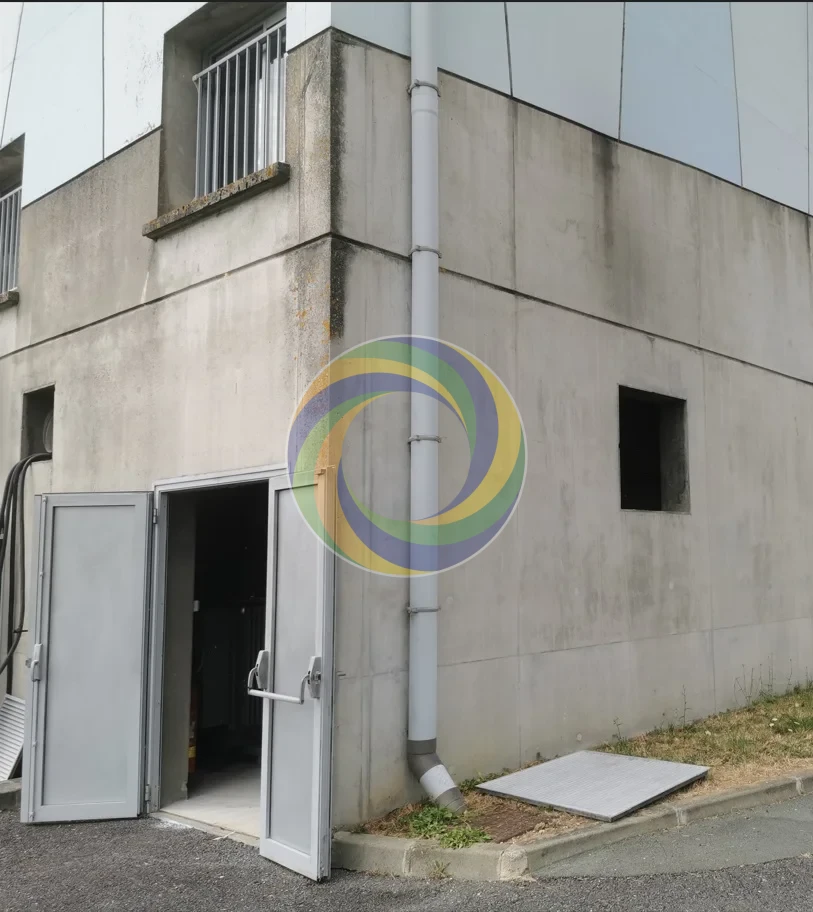 L’entrée de cette cabine haute tension présentait d’importants dépôts de suie sur les murs en façade et les portes métalliques, altérant l’esthétique du bâtiment et la sécurité visuelle du site.